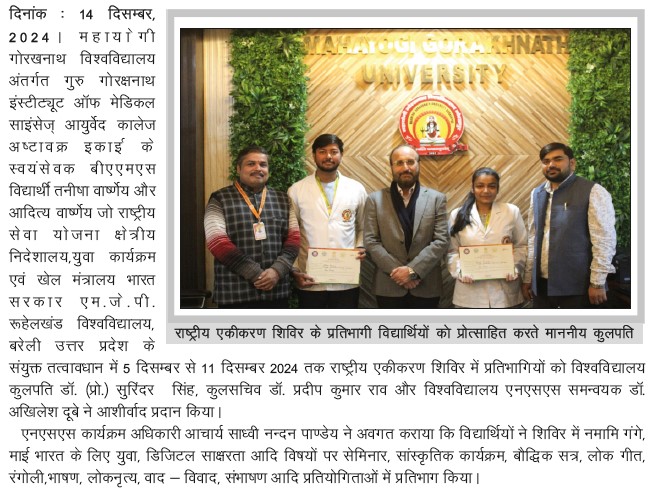| राष्ट्रीय एकीकरण शिविर में सम्मिलित राष्ट्रीय सेवा योजना स्वयंसेवकों को माननीय कुलपति जी ने दिया शुभाशीष | View | 14-Dec-2024 |